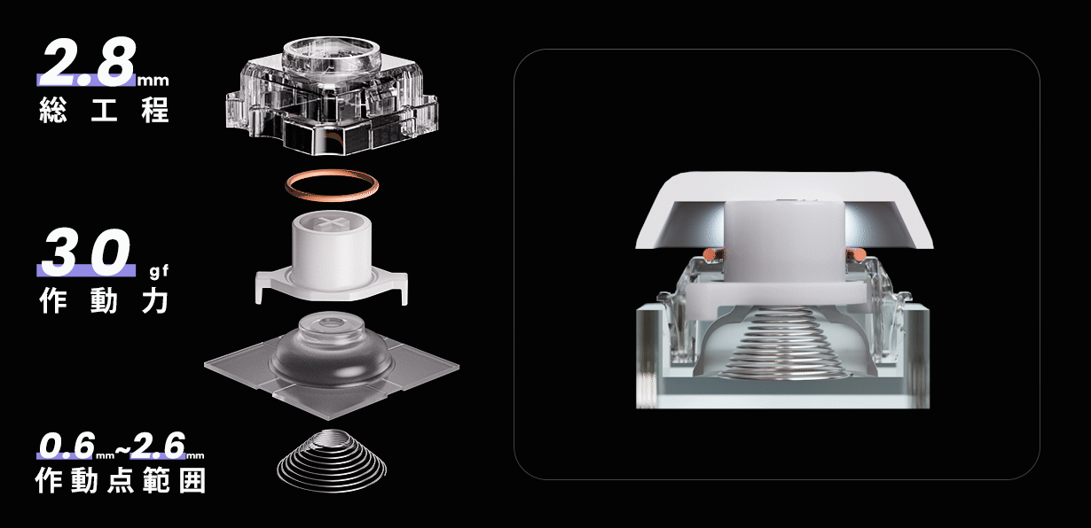 スムーズな打鍵感と驚異的な反応速度により、日常的な作業から激しいゲームプレイまで、あらゆるシーンで快適に対応可能です。