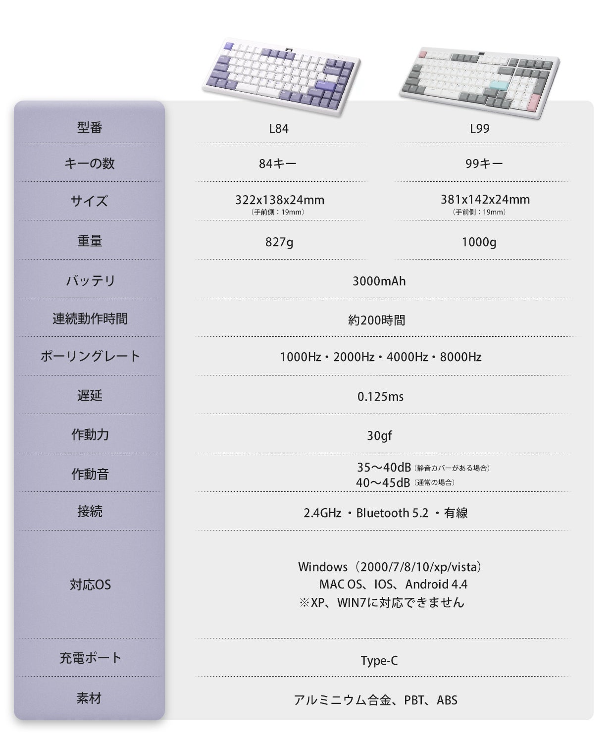 L84は30gfという軽い押下圧を採用し、キーの押下に必要な力を大幅に軽減し、ユーザーのニーズに応えています。