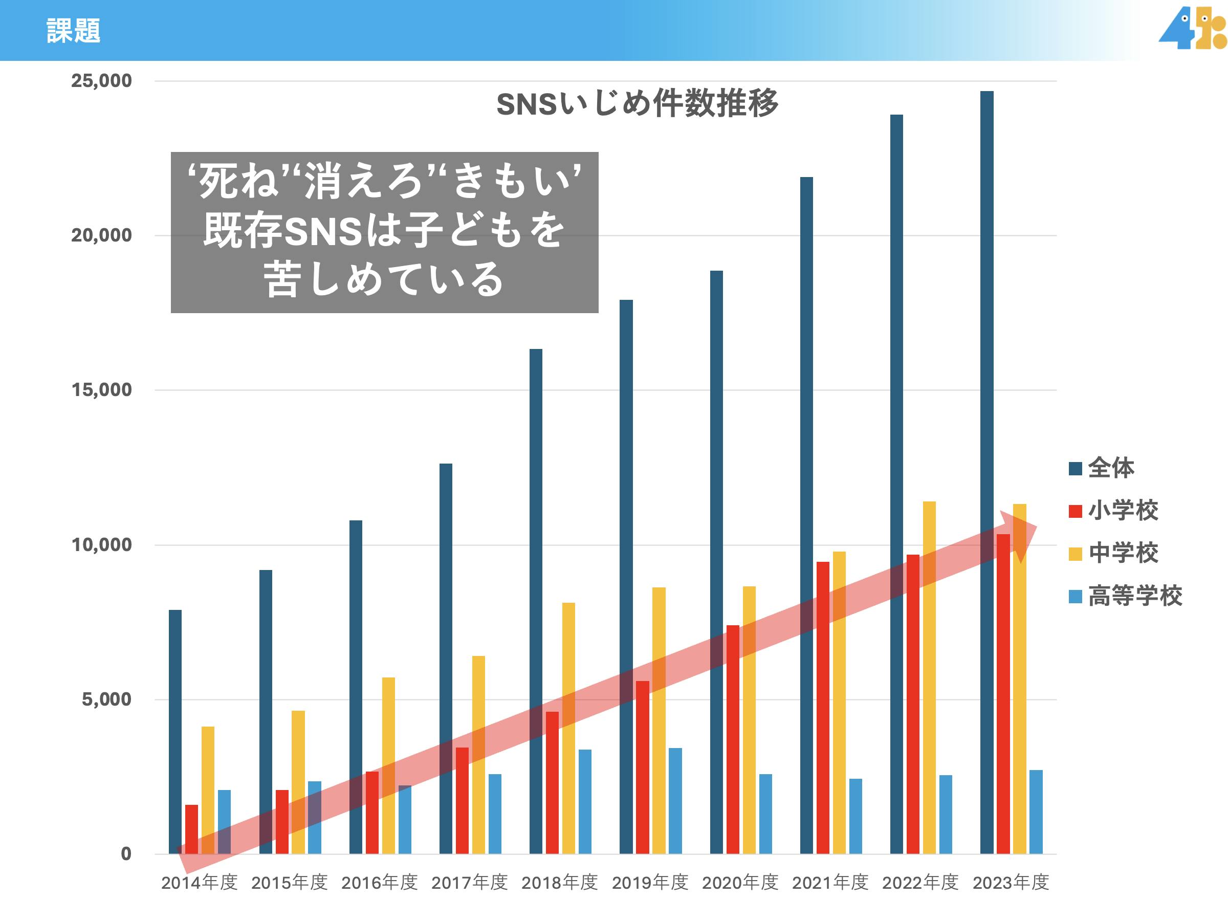 特に小中学校において、SNSいじめが急増し続け、誰も止めることができていない現状にあります。