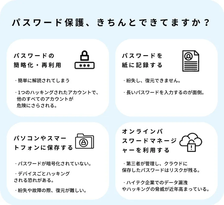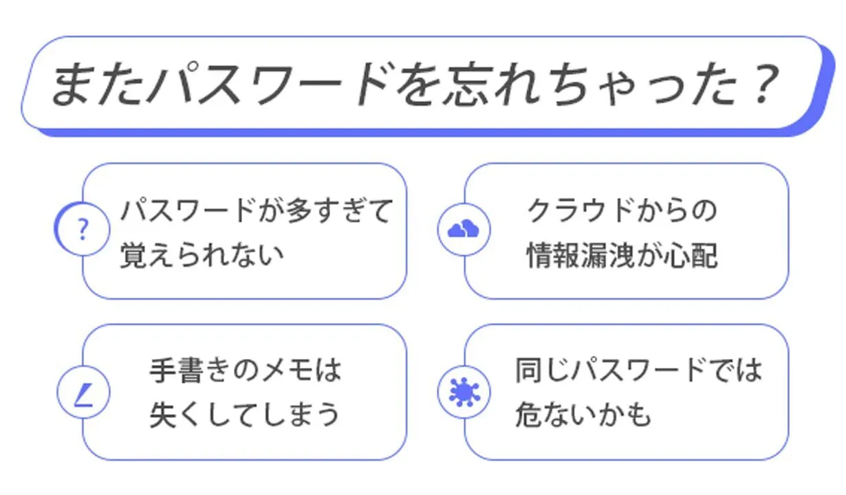 パスワードの条件要求はどんどん厳しくなっています。3か月に1度更新しなければいけなかったり、文字数や記号の規定があったり、多くのパスワードを覚えることは現代人の悩みの1つとも言えます。