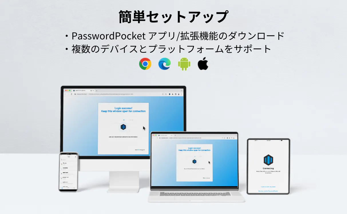 PasswordPocketのアプリもしくはブラウザ拡張機能を使用して、複数のデバイスとプラットフォームのパスワードを管理しましょう。すべてのパスワードを整理し、スマートフォン、タブレット、パソコンからアクセスできるように保管します。