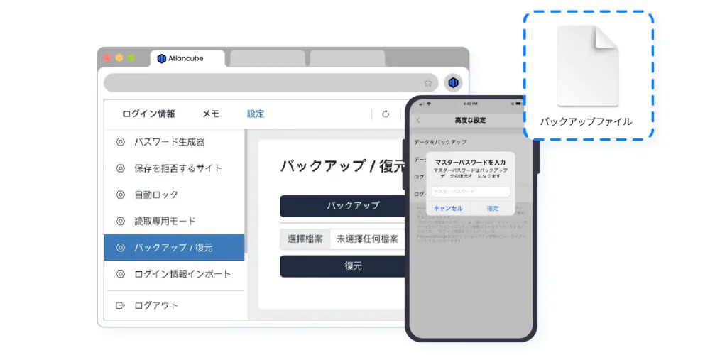 バックアップ後のデータはすべて暗号化され、復元する際はマスターパスワードが必ず必要となります。また、パスワードなどのデータを最新に保つため、バックアップは定期的に行うことをおすすめいたします。