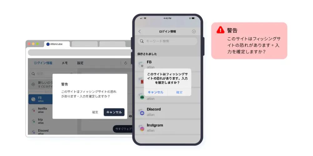 フィッシングサイト検出機能で、PasswordPocketはログインしたいURLを検知します。URLに疑問がある場合は即座に警告が表示され、誤って偽サイトへアクセスすることを防ぎます。