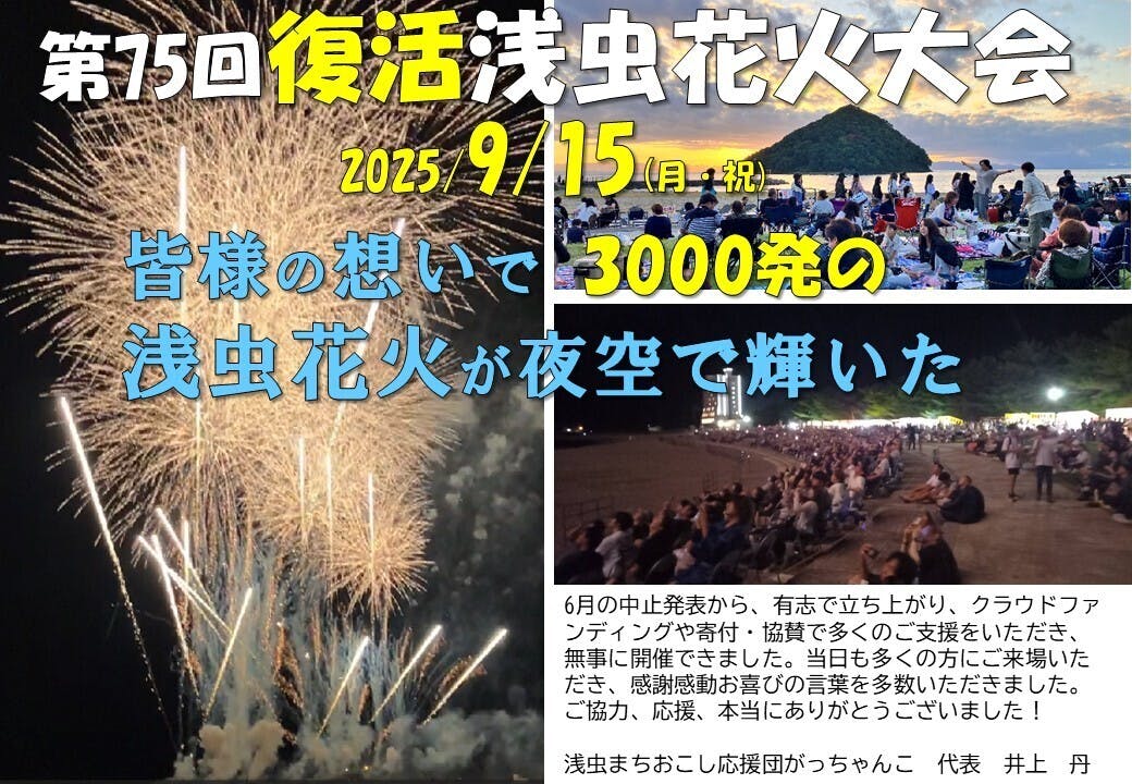 2025/09/30 20:14ご支援いただいた皆さまへ浅虫まちおこし応援団がっちゃんこ代表の井上です。この度はクラウドファンディングにてご支援をありがとうございました。ご報告が遅れましたことをお詫び申し上げます。お陰様で9月15日(月・祝)に第75回復活浅虫花火大会が開催できました。皆さまのご支援と、地域からの協賛を多数いただき、昨年と同規模の花火大会が実施できました。当日はたくさんの方がご来場され、観覧した方から、「感動した」「復活してくれてありがとう」「今まで最高だった」等のお喜びの言葉を多数いただきました。今回の経験を活かして、来年以降も浅虫で花火が輝くように頑張っていきますので、引き続き応援をよろしくお願いいたします。 もっと見る