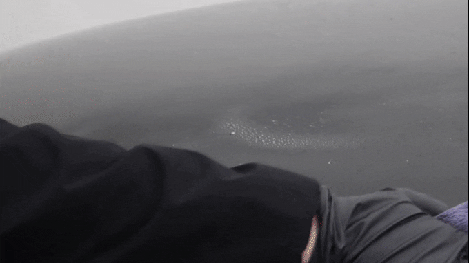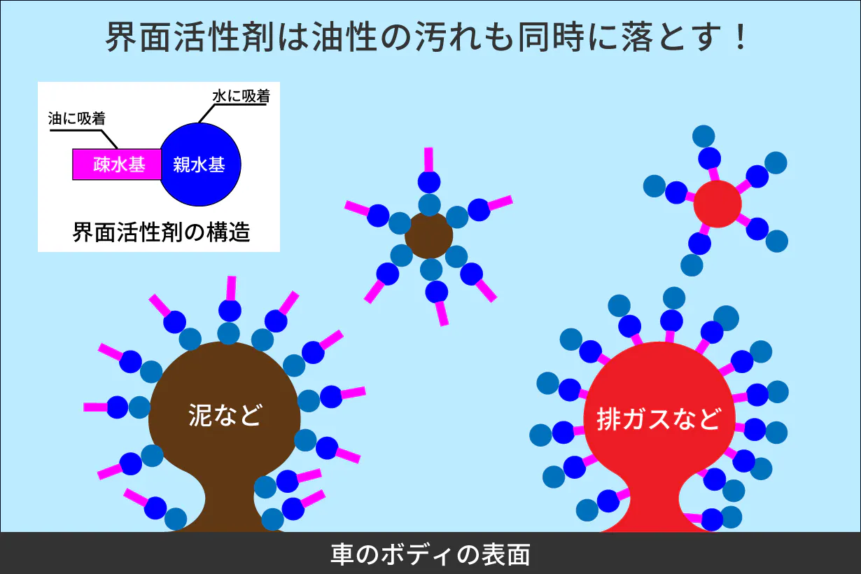 Fast Washを吹きかけると界面活性剤が水の粒子と油性の汚れ両方にくっつき、油性の汚れも一緒にボディから引きはがします。