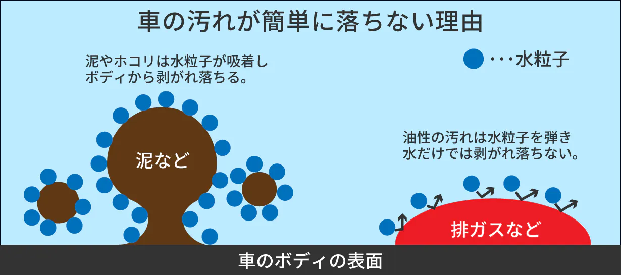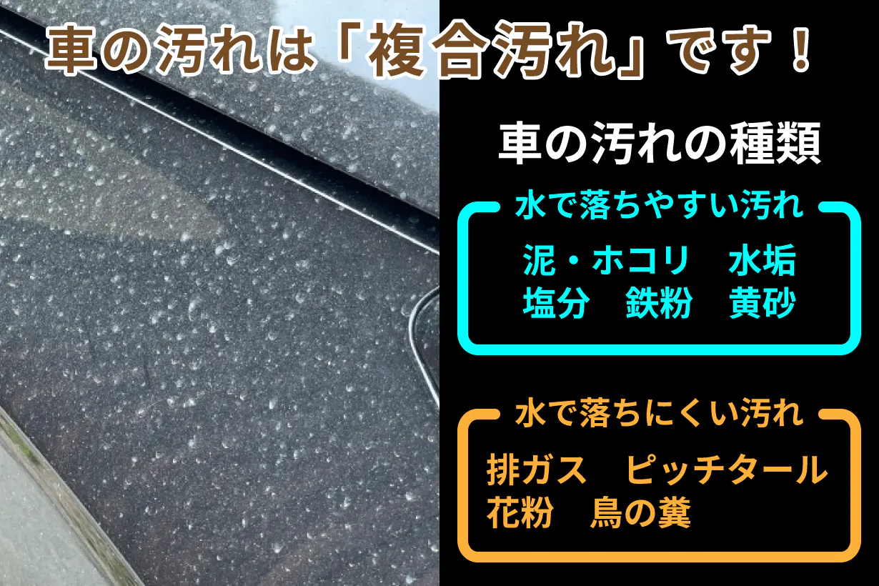 実は車の汚れは水で落ちる泥やホコリばかりではなく、排ガスや鉄粉、花粉、道路の舗装のピッチタールなどを含む複合汚れです。