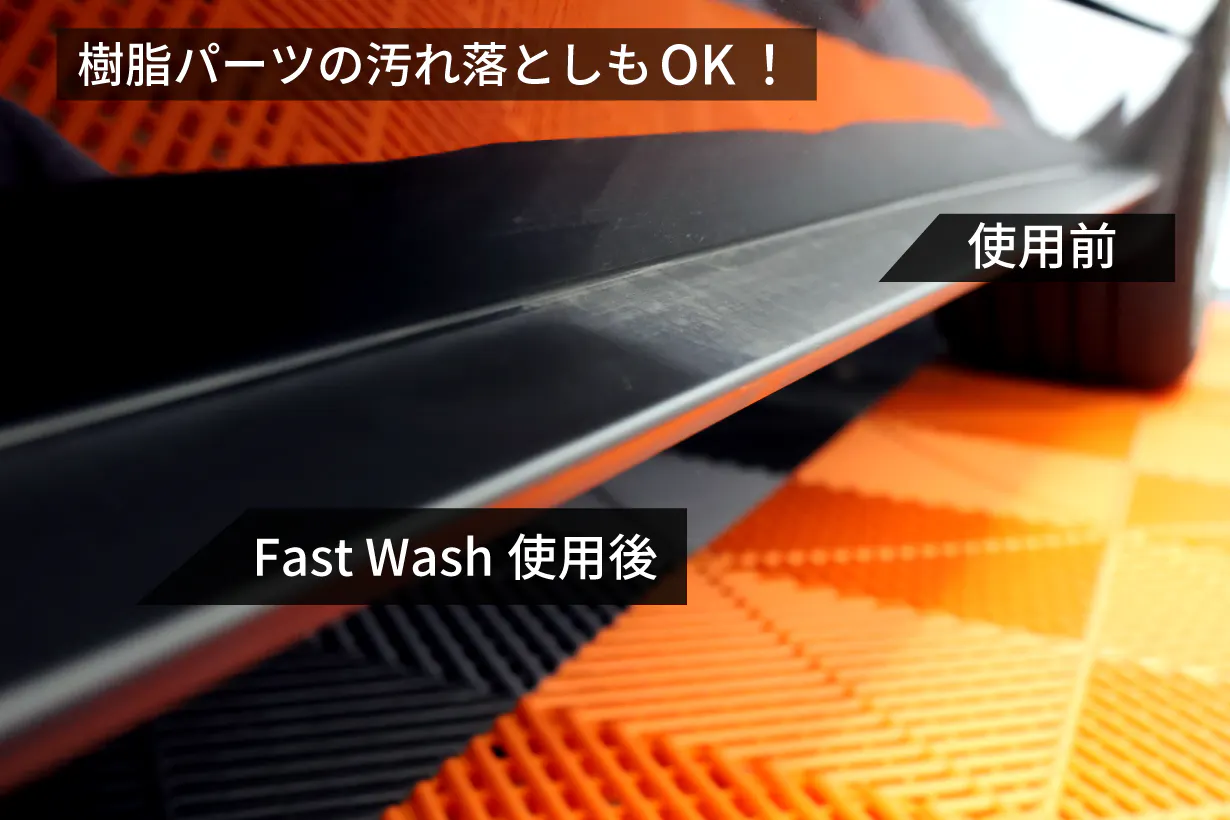 またFast Washは車のボディの塗装面ばかりではなく、バンパーやサイドミラーのケースなど樹脂パーツの汚れもきれいに落とし、ピカピカ、つるつるに。