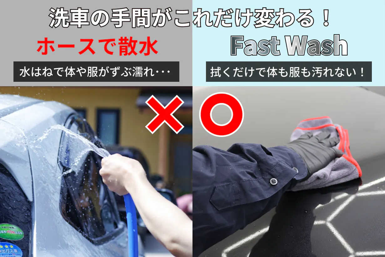 ホースやバケツで水を車に掛けると、水や泥跳ねで服が濡れたり汚れたりしますが、洗浄液を吹きかけて拭くだけのFast Washならその心配も無用。