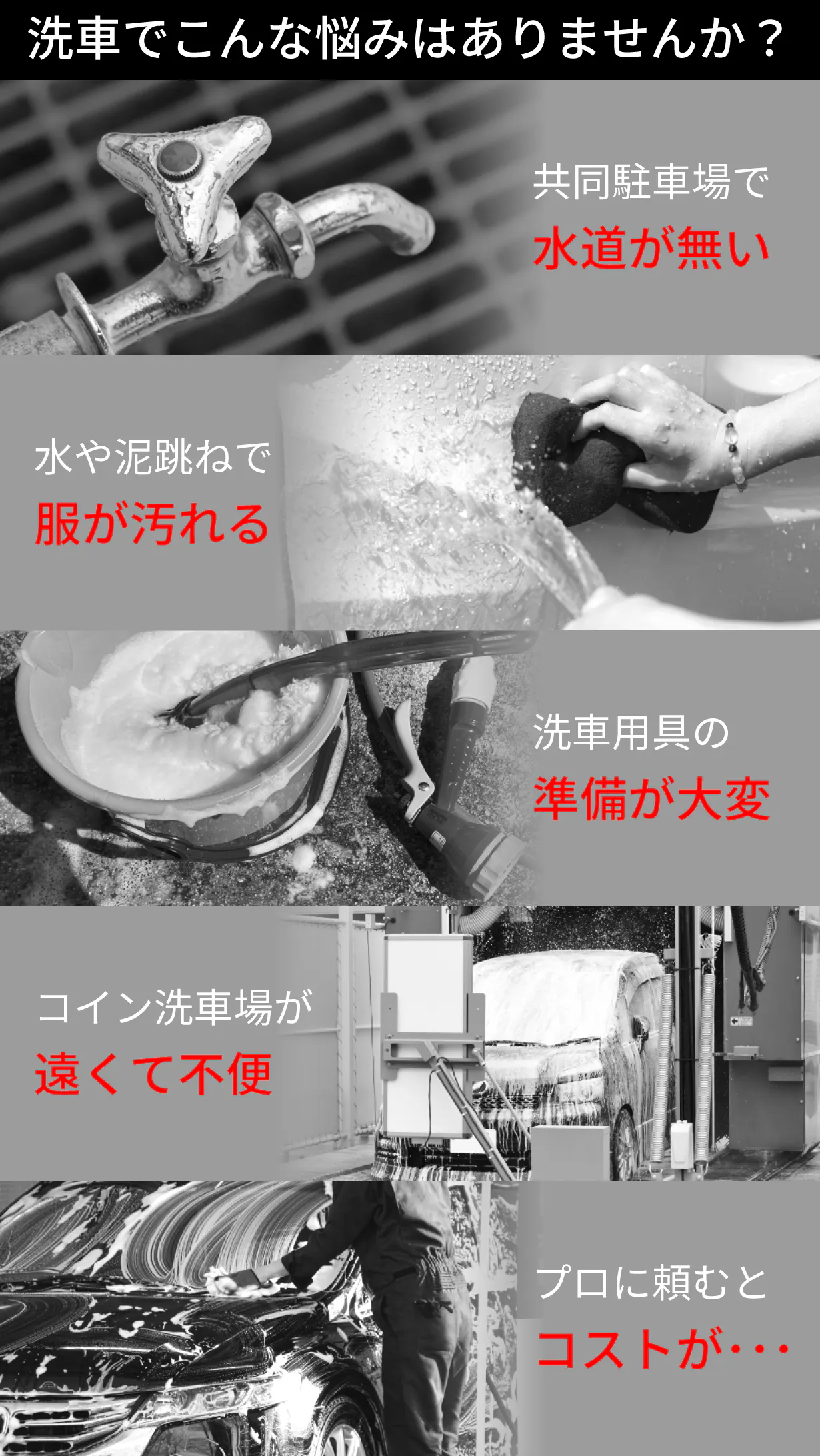どこでも洗車ができ、水道を求めコイン洗車場まで行く手間も時間も省けます。