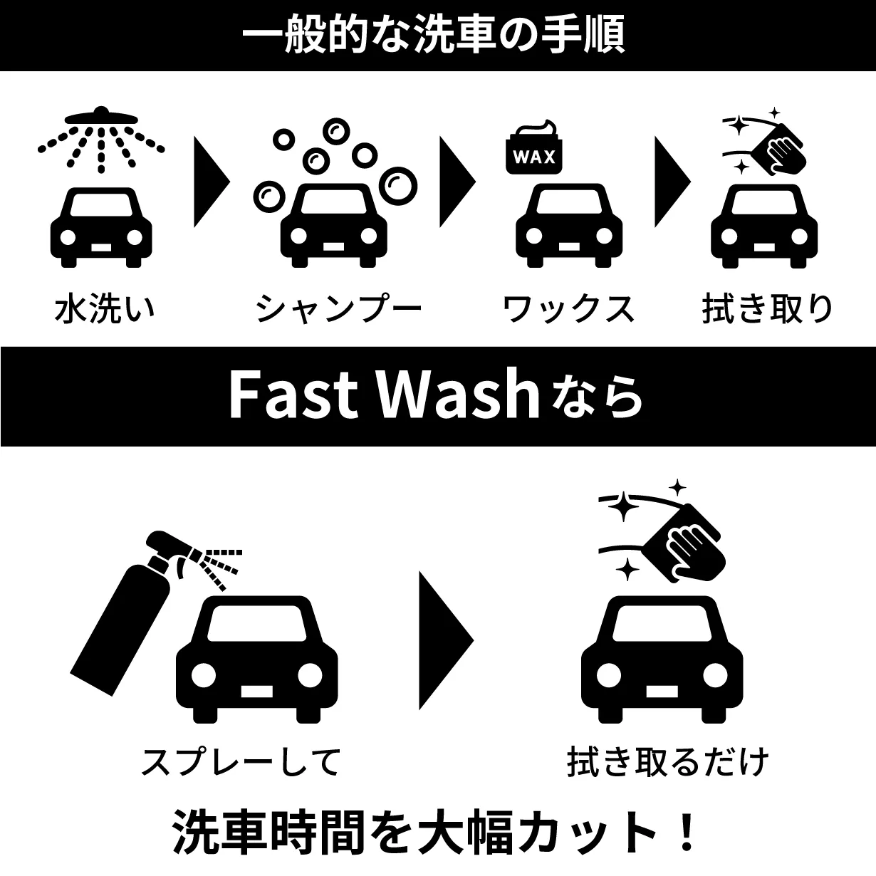 Fast Washの洗車で必要なのは、500mlのボトルに入ったFast Washとマイクロファイバークロスだけ。