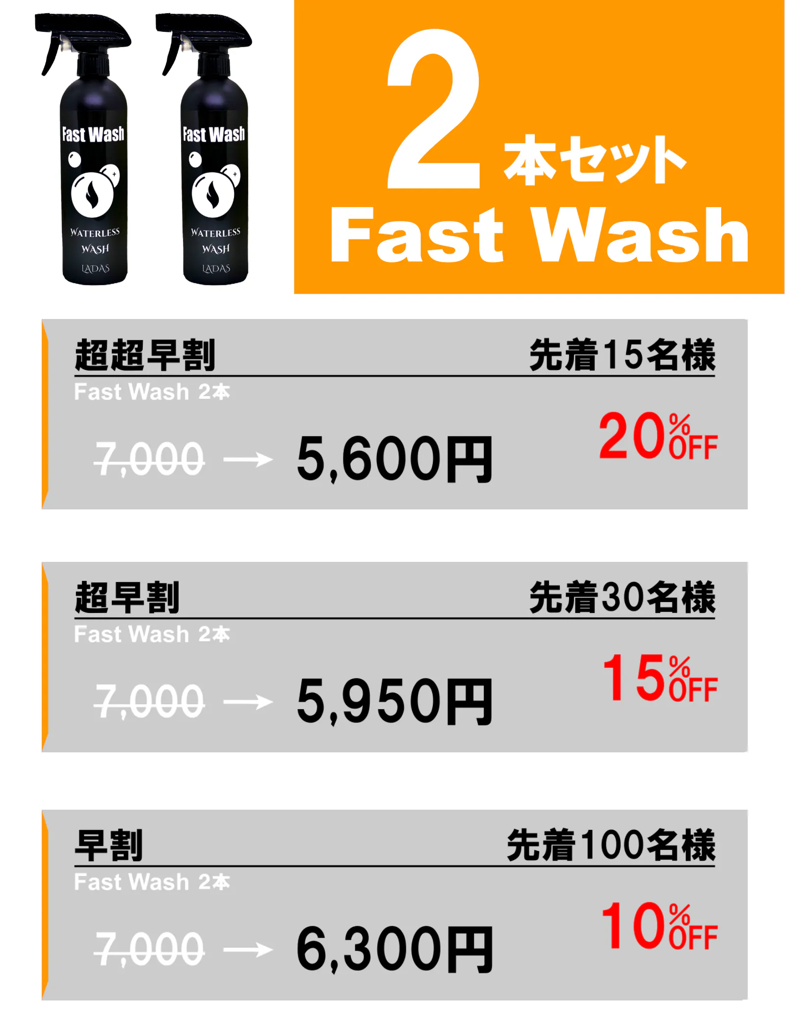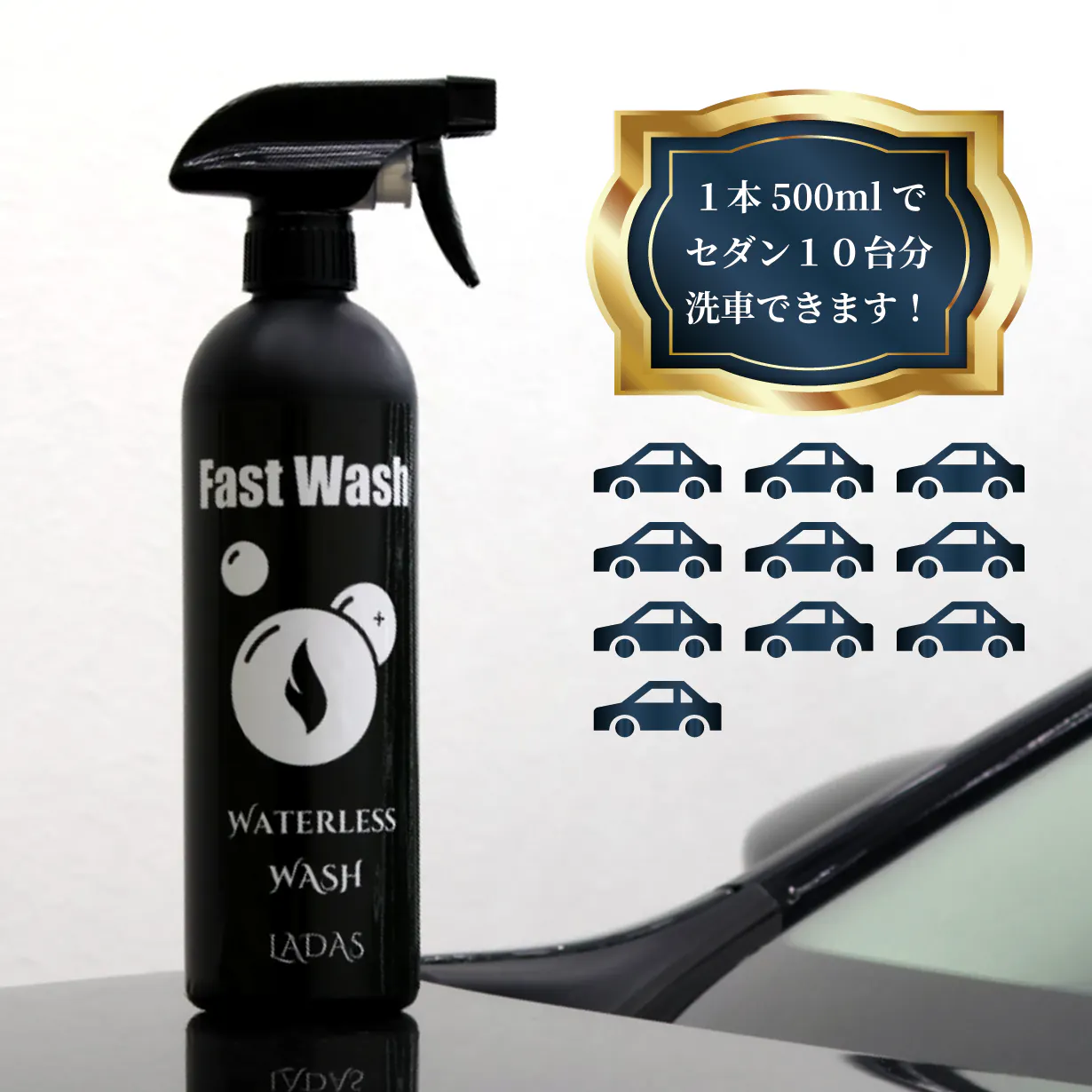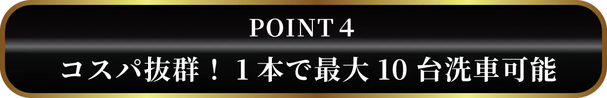 Fast Washは1本で500mlですが、セダンなどのミドルサイズの車なら最大で10台分も洗浄できます。