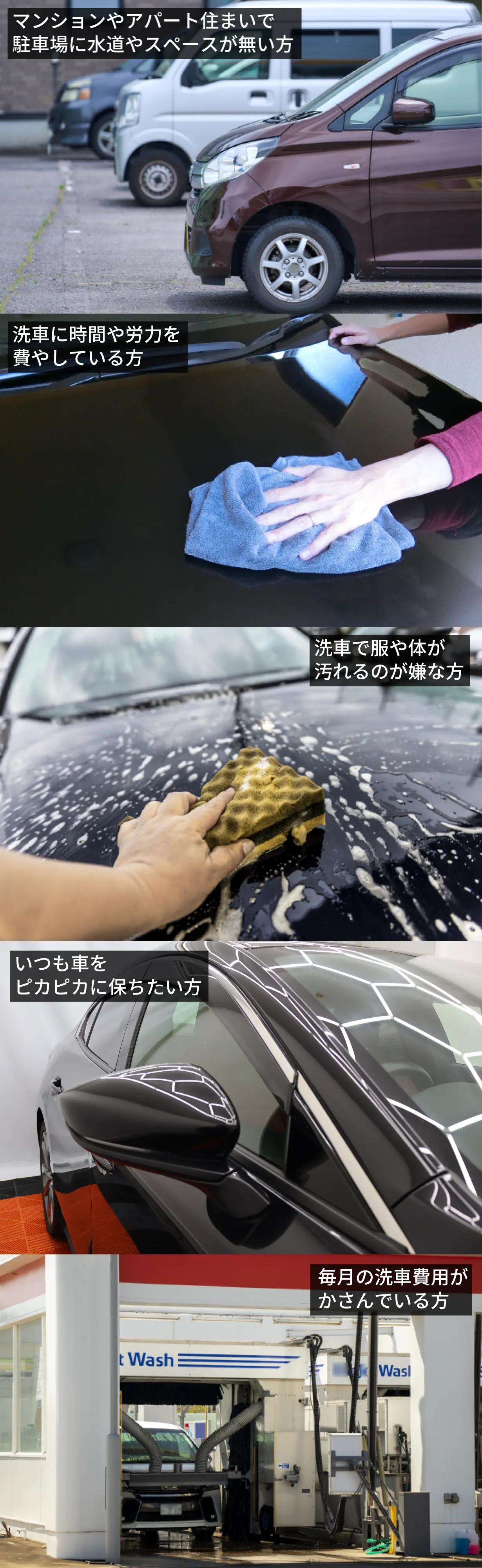 機械洗車に関しましても①ガソリンスタンド等への交通時間、②洗車の待ち時間、③拭き取りと、どうしても時間がかかってしまいます。