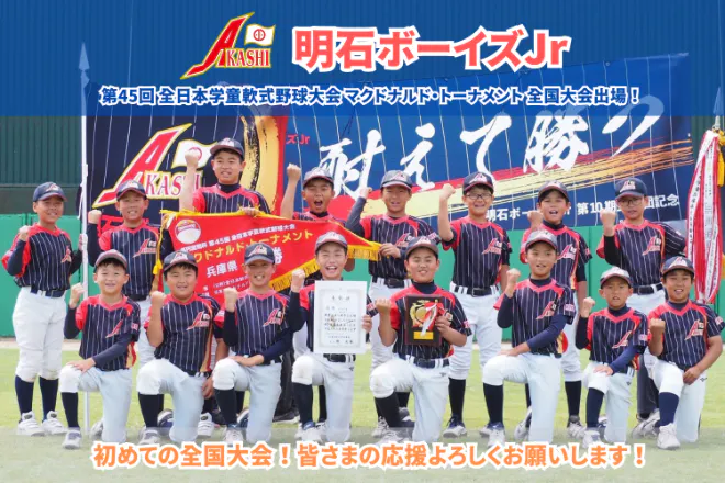 明石ボーイズJrは、小学生の甲子園ともいわれる「全日本学童軟式野球大会 マクドナルド・トーナメント」の兵庫県予選を見事に勝ち抜き、チーム発足から11年目にして、悲願の初・全国大会出場✨
