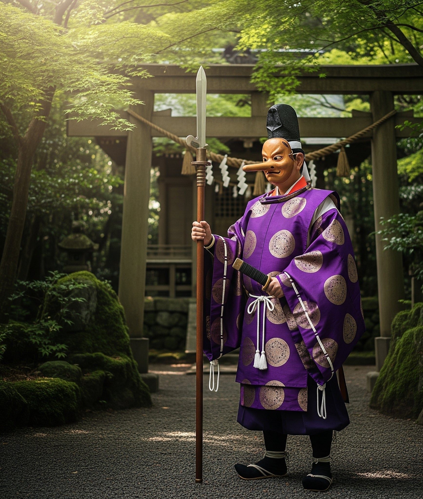 一般的に、紫色や紺色の高貴な色の直垂に特徴的な高い烏帽子を身につけ神聖な鉾を手に持ちます。