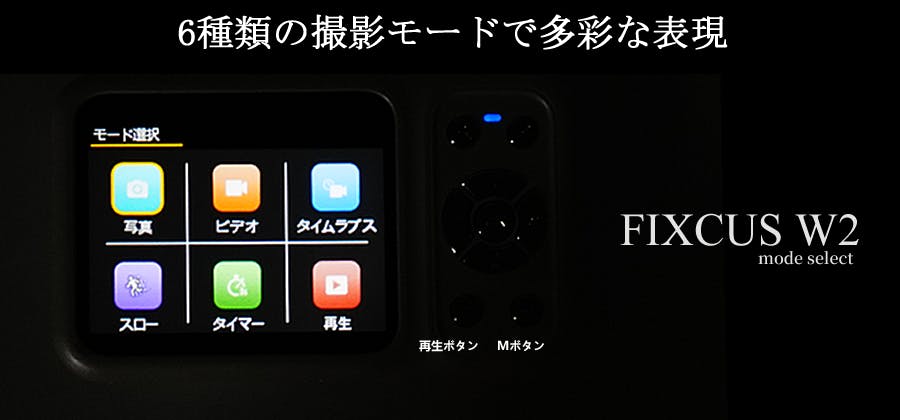 FIXCUS W2の撮影モードは写真、ビデオ、タイムラプス、スロー、タイマー、再生と6区分に分けられており、撮影したい被写体やアングルによって撮影モードを選ぶことが出来ます。