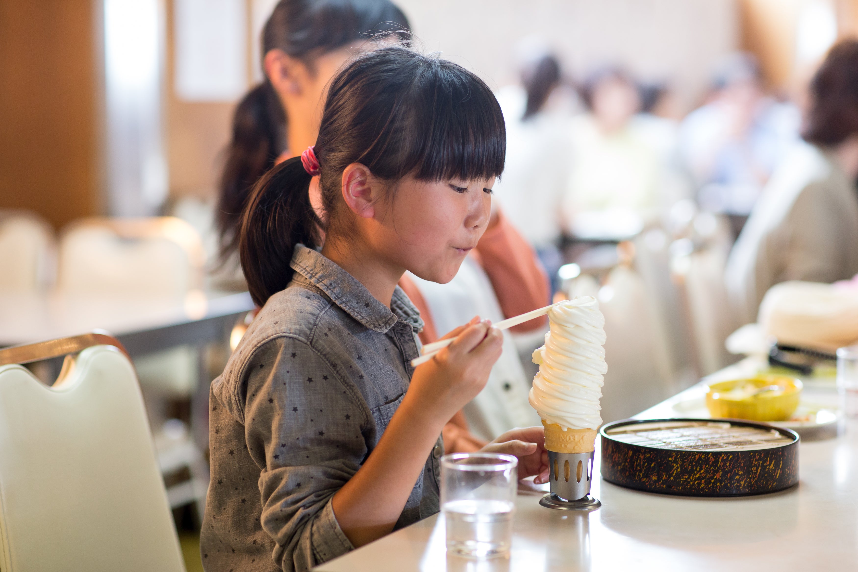 オレンジ色の箸立てから箸をとり、長いソフトクリームを食べる、