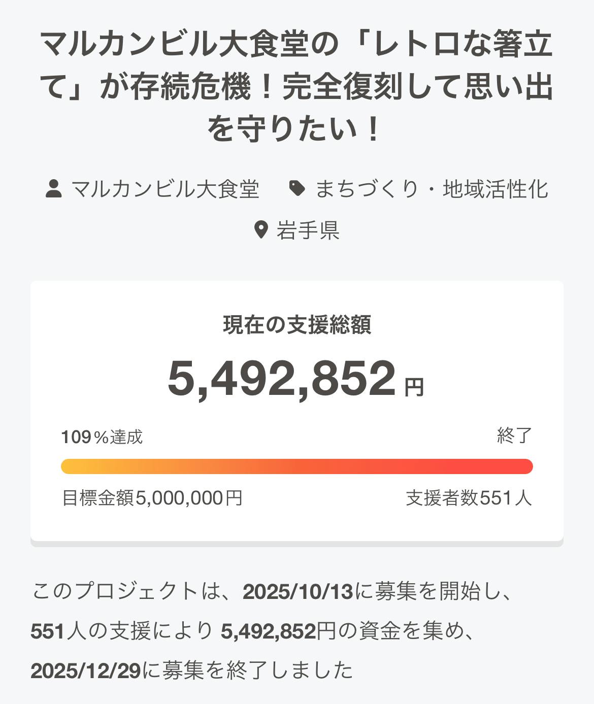 2025/12/30 01:02箸立て復刻プロジェクトは、12月29日(月)23時59分をもちまして終了いたしました。ご支援総額はCAMPFIREでのご支援 5,492,852円、現金でのご支援 341,000円、合計 5,833,852円 となりました。この挑戦を通して、本当に多くの言葉や記憶、そして皆さまの想いに触れることができました。それは、金額や結果以上に大きな財産だと感じています。ご支援くださった方、応援の言葉を寄せてくださった方、そっと見守ってくださった方、すべての関わりに、心より感謝申し上げます。このプロジェクトに目を留めていただき、本当にありがとうございました。リターンにつきましては、これより順次進めてまいります。進捗についても随時ご報告いたしますので、引き続きどうぞよろしくお願いいたします。 もっと見る【目標達成いたしました】