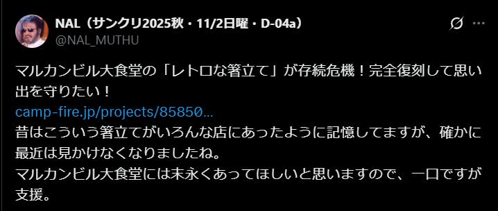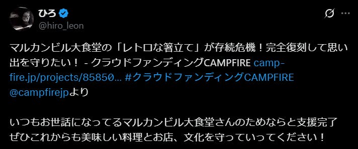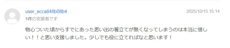思い出の場所を次世代につなぐ「箸立て復活プロジェクト」もしよろしければ、ご家族・ご友人にもぜひシェア&応援いただけると嬉しいです!
