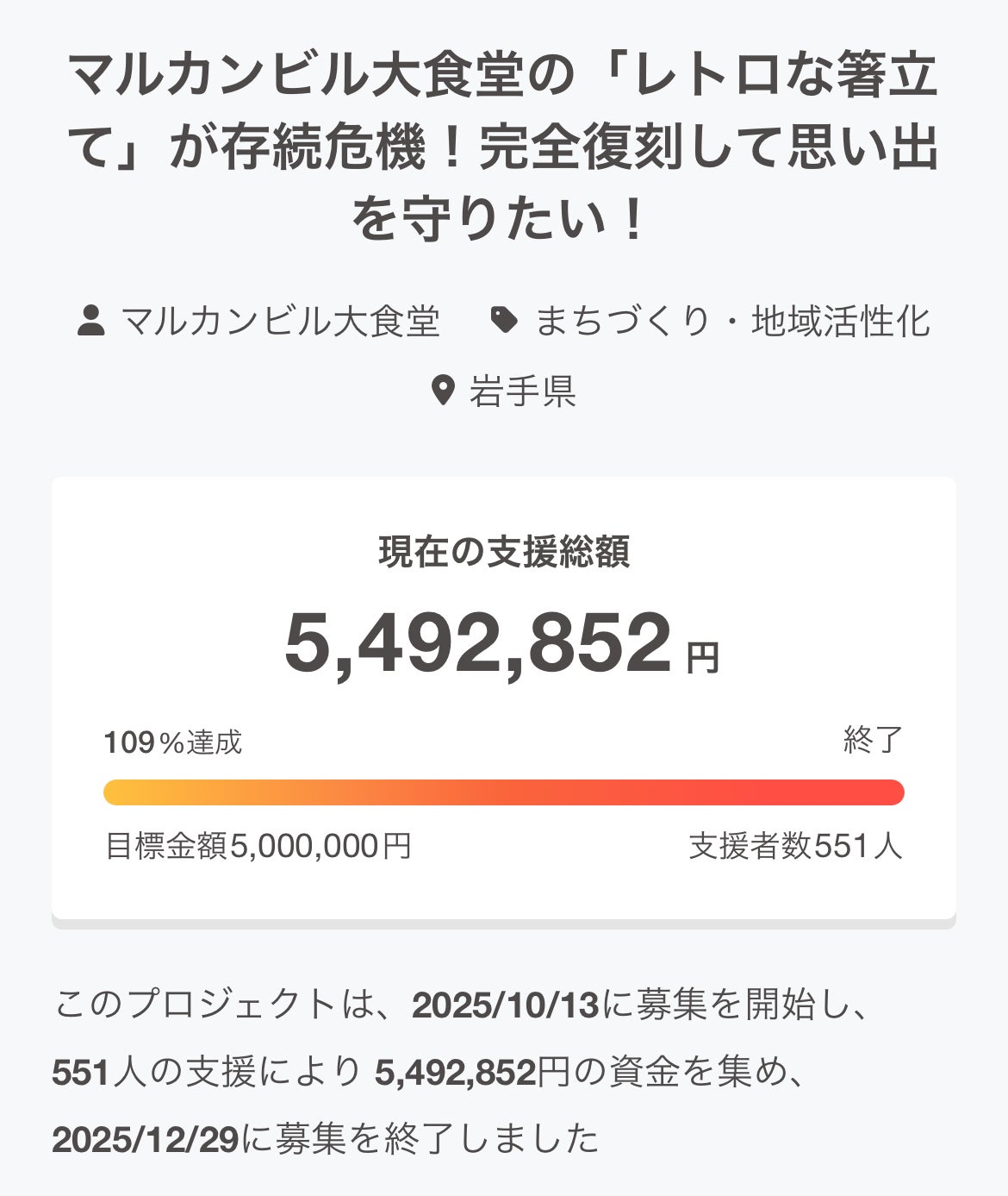 2026/04/02 17:30いつもありがとうございます。マルカンビル大食堂です。4月2日、花巻では季節外れの"みぞれ"が降りました。今年はなかなか暖かくならないな……と思うのもつかの間、週末の最高気温はなんと20度!体調管理には気を付けていきたいものです。そんな悪天候の中でも、マルカンビル大食堂は大賑わい。春休み期間ということもあり、毎日多くのお客様にお越しいただいております。本当にありがとうございます。さて、箸立て復刻プロジェクトでは、一部リターン品の発送と、個人・企業スポンサーの皆様の企業広告卓上POPおよび館内パネルの設置を行いました!今回発送いたしましたのは、・オリジナルグッズ3種・グッズ3種&ソフト券5枚・グッズ3種&カレー3食+ボンゴレ3食をお選びいただいた方へのリターン品です。お手元に届くまで、ぜひ楽しみにお待ちいただけますと幸いです!「箸立て」および「シリアルナンバー入り箸立て」を含むリターン品につきましては、パートナーでありますスワニー社にて、予定通り鋭意製造中です。マルカンビル大食堂のテーブルに並ぶ「箸立て」に先行し優先的に製造を進めていただいております。4月下旬には発送開始できる見込みですので、今しばらくお待ちくださいませ。6階レジ待機場所付近には、個人・企業スポンサー様へのリターンとしましてPOPパネルを設置いたしました。また大食堂の全125テーブルには企業スポンサー様へのリターンとしまして企業広告を設置いたしました。「箸立てのある風景」を一緒に守ってくださった皆様、本当にありがとうございます!マルカンビル大食堂にお越しの際は、ぜひご覧ください!新しい箸立てを迎える準備も着々と進んでおり、私達もドキドキ・ワクワク首を長くして待っております。「ソフトクリーム巻き体験」や「復刻記念パーティー」のリターン準備も順次進めております。ご支援いただいた皆様と直接お会いできることを、心より楽しみにしております。進捗につきましては、今後も活動報告にてお知らせしてまいります。新しい箸立ての完成とその後をどうぞ楽しみにお待ちください!マルカンビル大食堂 もっと見る