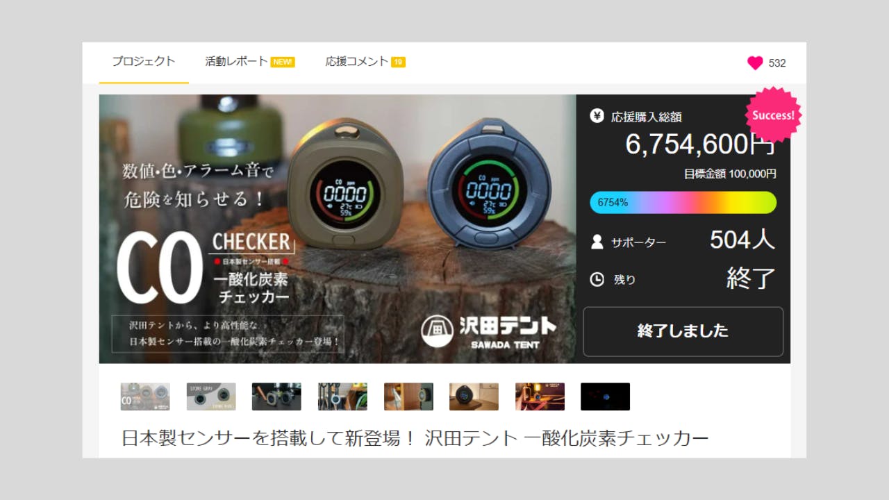 2025/10/16 13:50こんにちは、沢田テントです。いよいよ本日23:59をもって、沢田テント一酸化炭素チェッカープロジェクトが終了いたします。日々着々と応援をいただいており、一番お得な「CAMPFIRE限定セット超早割」は開始2日で完売いたしました。サポーター様も19名となり、(あと1名で記念すべき20名!笑)応援いただいた皆様、本当にありがとうございます。残り時間10時間。リターン品は10月末までにはお届けできますので、秋冬キャンプやこれからの暖房シーズンに向けて検討いただいてる皆様、このチャンスをどうぞお見逃しなく。引き続きどうぞよろしくお願いいたします。 もっと見る