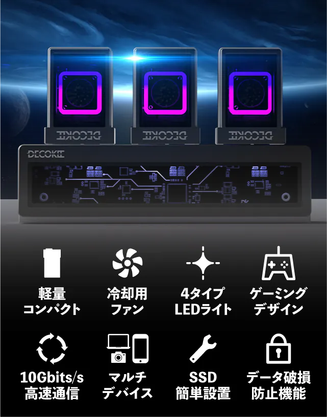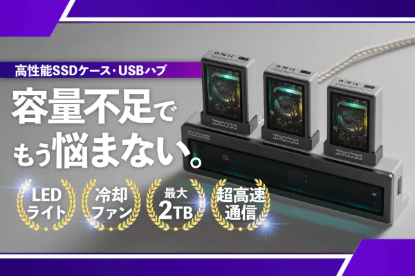 超高速転送&冷却機能搭載!コンパクトSSDケース DECOKEE DK-DISKでデータ管理をもっとスマートに。容量が足りない… スマホやPCの動作が遅い… 写真を動画を容量を気にせず撮りたい…などの悩みを解決します。