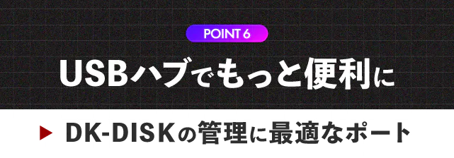 ノートPCやその他の端末を使用する時にUSBポートが足りたくなったことはありませんか?DK-HUBはDK-DISKの管理用はもちろん、普段のPCに使うUSBハブとしてもおすすめです。