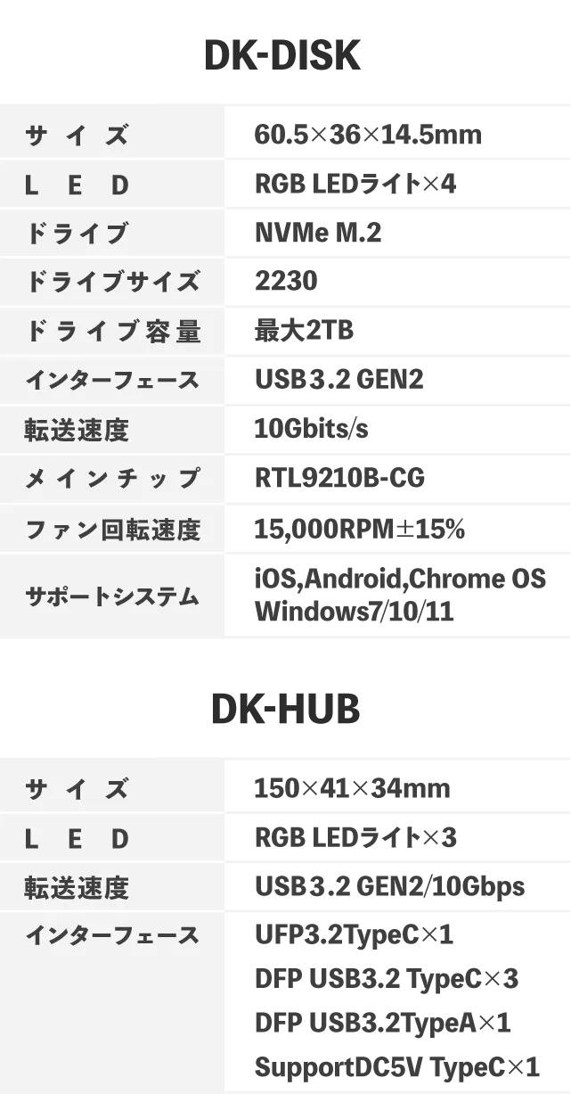 DK-DISKは性能だけでなく見た目にもこだわっています。LEDライトを搭載し、ゲーミングPCのようなデザインで使いたくなるデザインです。