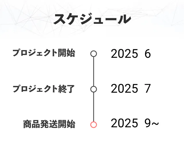 ※本文中に記載させていただいたスケジュールは、あくまでプロジェクト公開時点の予定です。ご支援の性質上、配送遅延のおそれがございます。