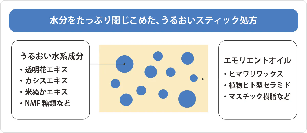 そこでオイル100%のスティックバームではなく、水分を与える保湿成分をスティック内部にたっぷりと閉じ込めた「水と油のスティック処方」を開発。