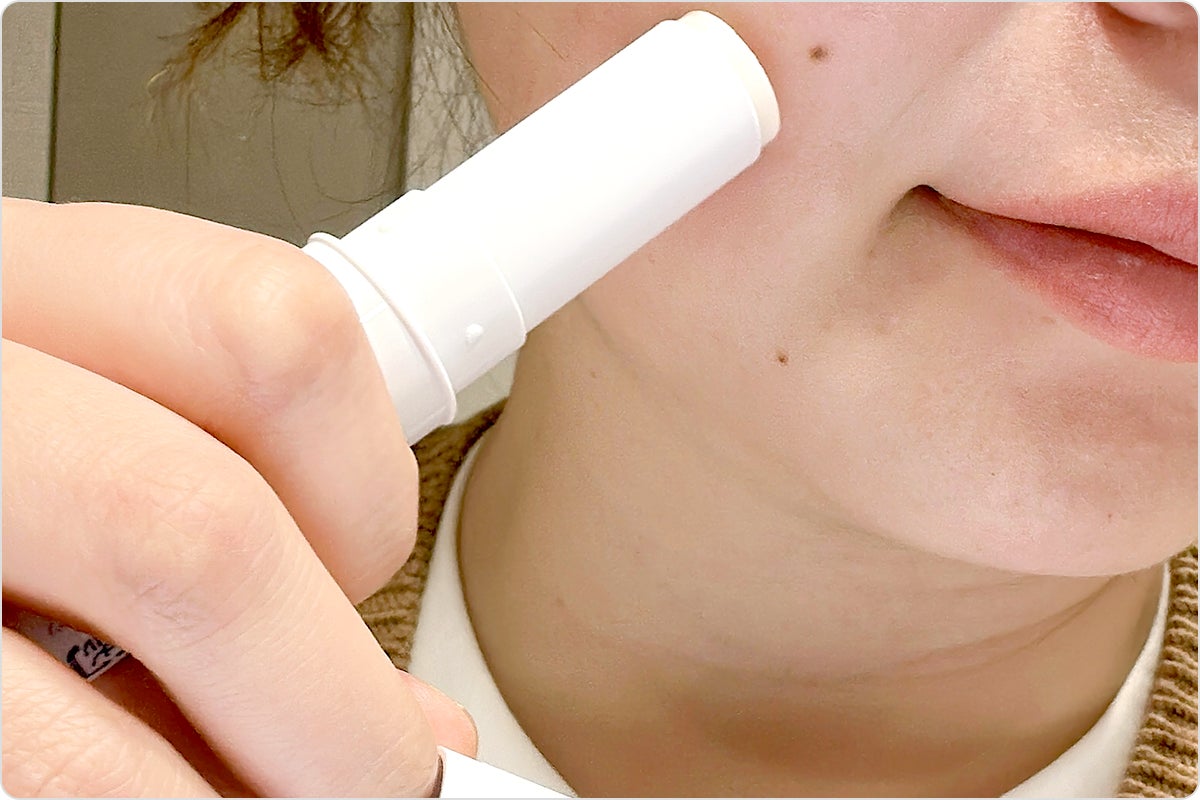スティック型なので、1~2ミリくらい繰り出して乾燥が気になるところや、ツヤを補いたいところに塗ってください。顔だけでなく、デコルテや手、爪先にもお使いいただけます。