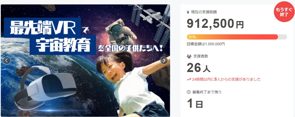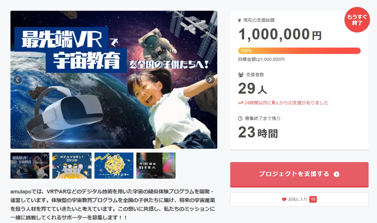 2025/08/31 00:13こんばんは、amulapoです!先ほど、目標金額の100%を突破し、プロジェクトがSUCCESSしましたことをお知らせいたします。ご支援・応援をいただきました皆さま、本当にありがとうございます。本プロジェクトの成功を励みに、全国の子供たちに宇宙体験を届けて参ります。ご支援をいただきました皆様には、今後も活動報告を通して開催の様子をご報告できればと思い、引き続きよろしくお願いいたします。本クラウドファンディングは8/31(日)が最終日となります。多くの方に知っていただけるように、最終日も発信してまいります。改めて、ご支援・応援をいただきました皆さま、本当にありがとうございました。9月に入りましたら、リターンのご連絡をさせていただきますのでよろしくお願いします。 もっと見る