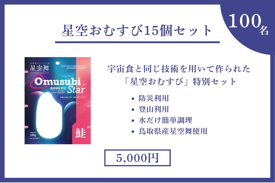 本商品は、JAXA宇宙日本食にも採用されている製造技術を活用し、製造は長期保存食のトップ企業・尾西食品株式会社が担当。使用する米には、鳥取県産のブランド米「星空舞(ほしぞらまい)」を100%使用し、やさしい甘みとふっくらとした食感を実現しました。