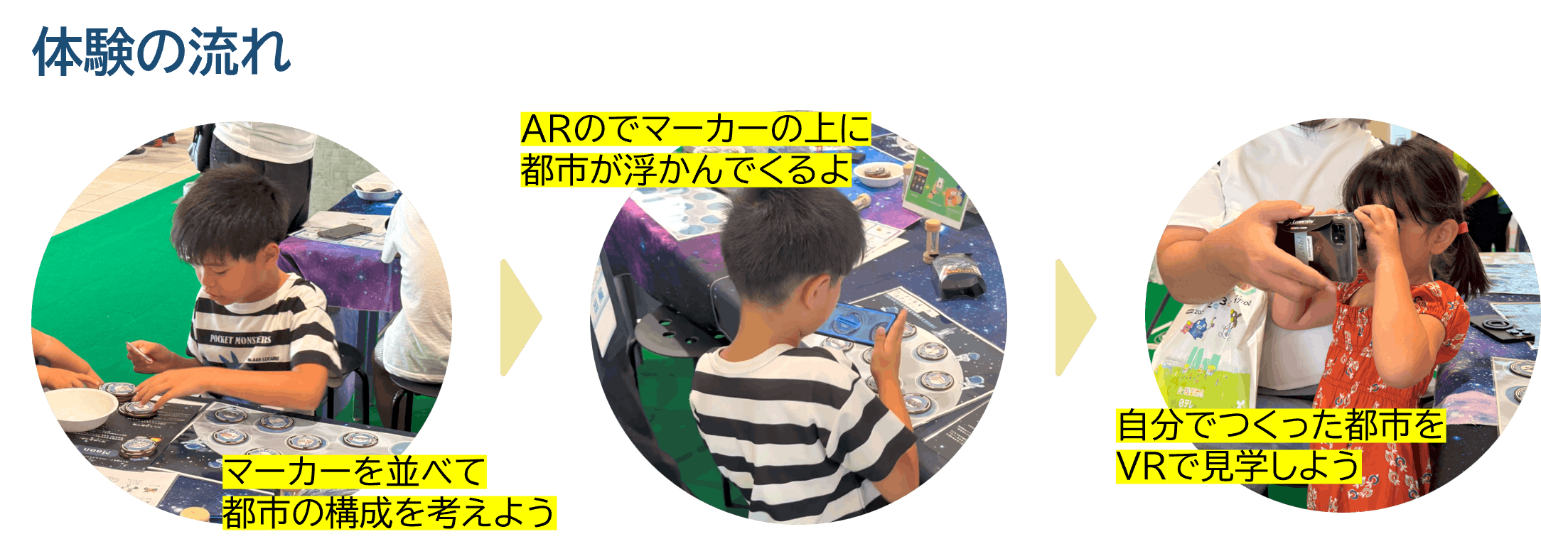 21種類の「月のまちカード」から9枚を選んでシートに並べ、自分だけの月面都市「ルナシティ」を組み立てます。この作品では、月での生活に欠かせない「暮らし」「インフラ」「探査」といった要素を、カードを通して楽しみながら学べるのが特徴です。完成した街はVRゴーグルを使って中を歩き回ることができ、自分が作ったルナシティを体感できます。さらに、自分の街がどのようなタイプかを診断する機能もあります!