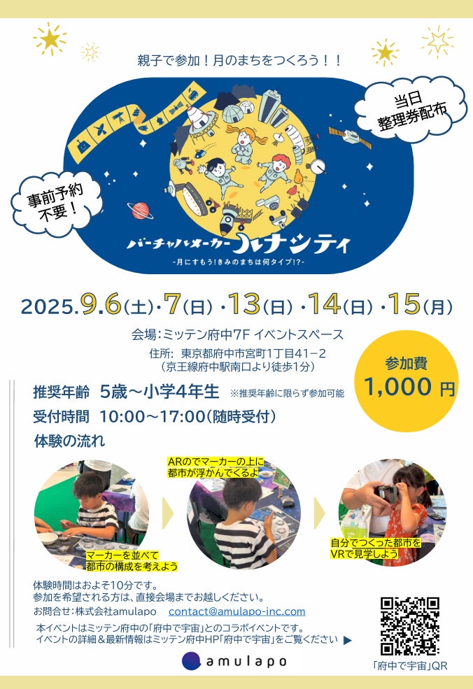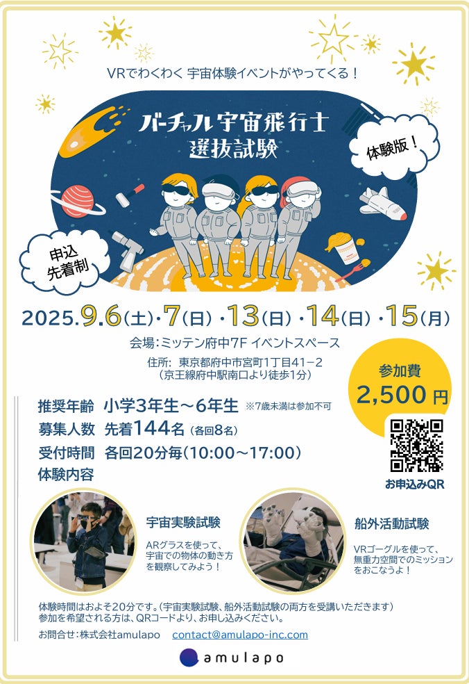 amulapo社は、メイン会場にて、9/6(土)、7(日)、13(土)、14(日)、15(月・祝)の日程で、「バーチャル宇宙飛行士選抜試験体験版」と「バーチャルメーカールナシティ」の2つの体験を提供させていただきます。