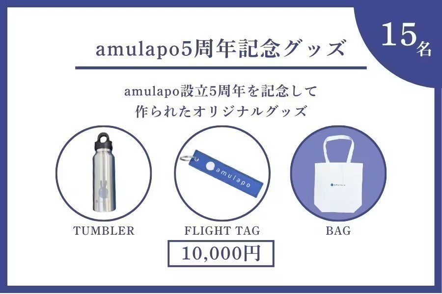 こんにちは、amulapoの田中です。本日は、 amulapo5周年記念グッズのリターンについて紹介をさせていただきます。株式会社amulapoは2025年2月28日をもって、おかげ様で5周年を迎えました。現在、日本では宇宙スタートアップが100社程度ありますが、amulapoは投資による資金調達をすることなく、これまで補助金や銀行融資も活用しながら、売上と自己資本にもとに続けてきました。現在では、役職員数で7名、インターン等のパートタイムで100名程度の登録がある規模にまで成長しております。これも、周りの皆様からの応援やご協力があってこそです。そのような中、5周年を迎えたタイミングで、まずは社内の関係者限定でお祝いをしようと企画し、その際に新商品開発に向けた取り組みとして、オリジナルグッズを試作しました。フライトタグです。発色もよく、結構しっかりとした生地で作られています。amulapoのロゴのデザインを考案いただきましたプロのデザイナーの方に設計をいただきました。タンブラーです。炭酸や酒類(ビール等)も入れられるタイプの最近はやっているやつです。社内からタンブラーが欲しいという需要が生まれ、商品開発に至りました。amulapoの新キャラクター(ラポくん)がデザインに入っています(デザイナーの方が、5周年記念にキャラクターを考案してくれました)。amulapoのロゴが入ったトートバックです。大きすぎず、デザインもスッキリしているので、日常のちょっとしたシーンで大活躍間違いなしです。私は、ちょっとした買い物の際や、バックに入りきらなかったものを持っていく際によく使います。現在、このフライトタグやタンブラーを持っているのは、amulapoの関係者のみの状況です。この非売品のグッズを本プロジェクトに共感をいただき、amulapoのメンバーに近い皆様にお届けさせていただきたいと思い、本リターンを作成させていただきました。非売品のため数に限りがあるリターンとはなりますが、amulapoを好いていただける方の手元に届けば嬉しいなと考えています。引き続き、クラウドファンディングをお楽しみください。田中克明