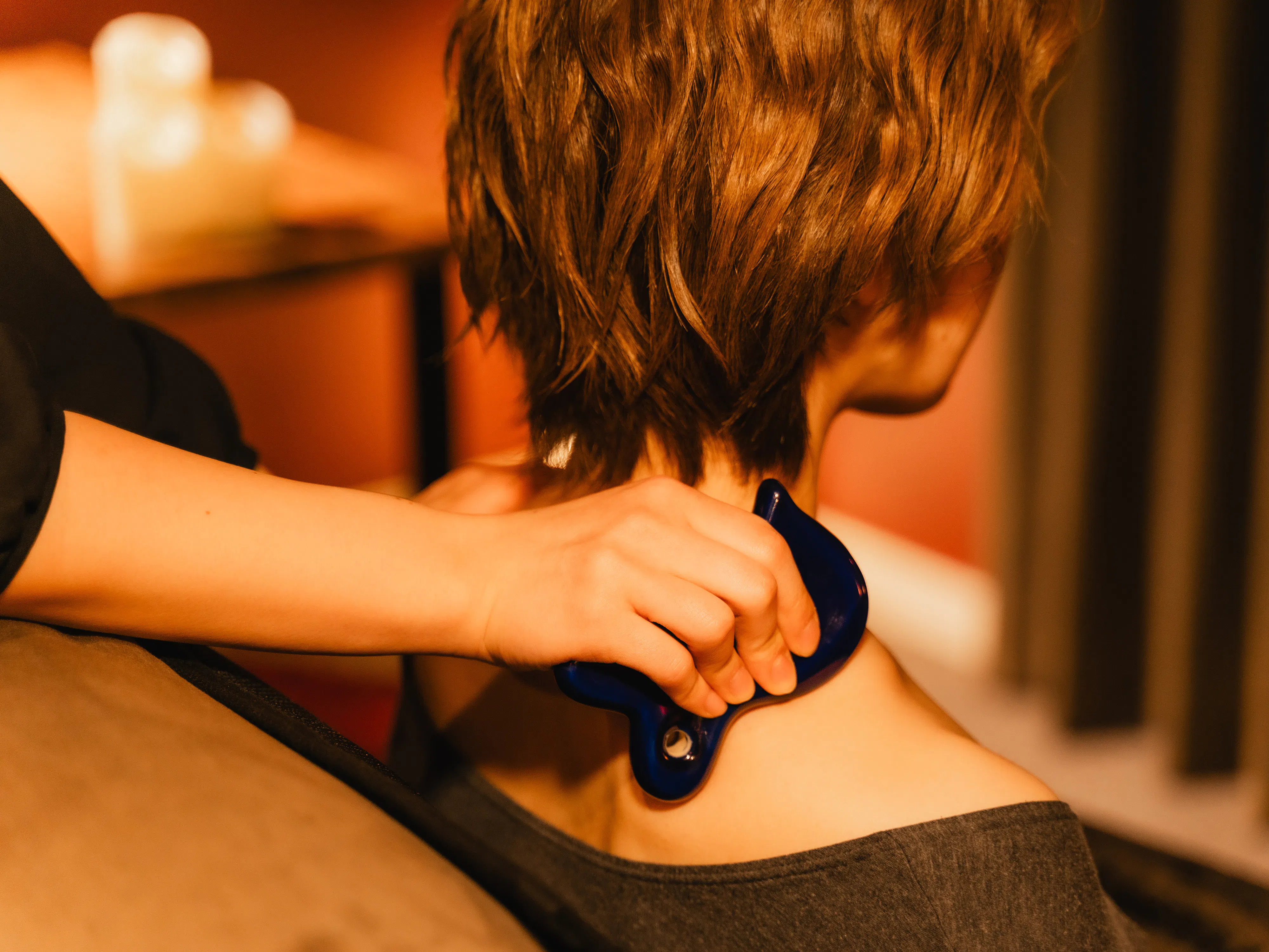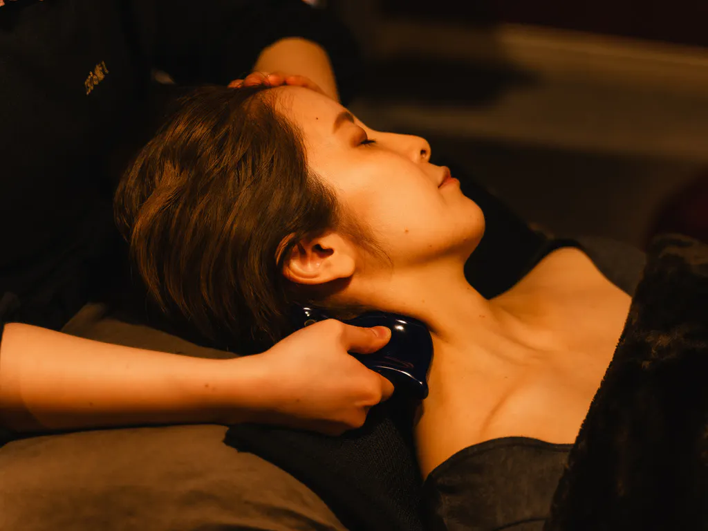 まずはデジタル機器の長時間使用で負担がかかっている”首”と、若年層でも慢性的なコリがあるといわれる”肩”全体の筋肉を、43℃の温かい日本式かっさでゆっくりほぐしていきます。筋肉がほぐれたら、毒素と言われる老廃物をけずって流していきます。この施術では、”赤み(痧しゃ・汚血)”が出ることがございます。”赤み(痧しゃ・汚血)”は出る量や濃さ、消えるスピードに個人差があります。施術前のカウンセリングでは、皆様の赤み・痛みへの不安、お悩みをお聞かせください。
