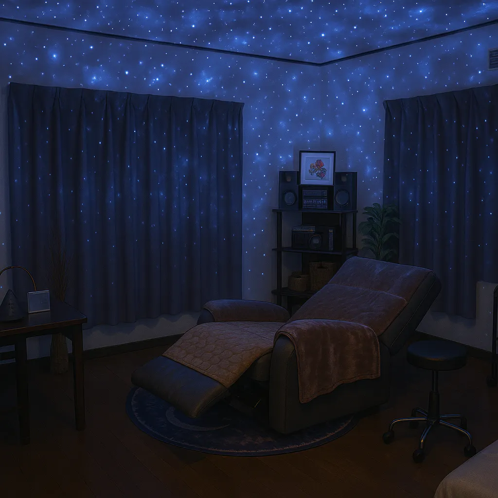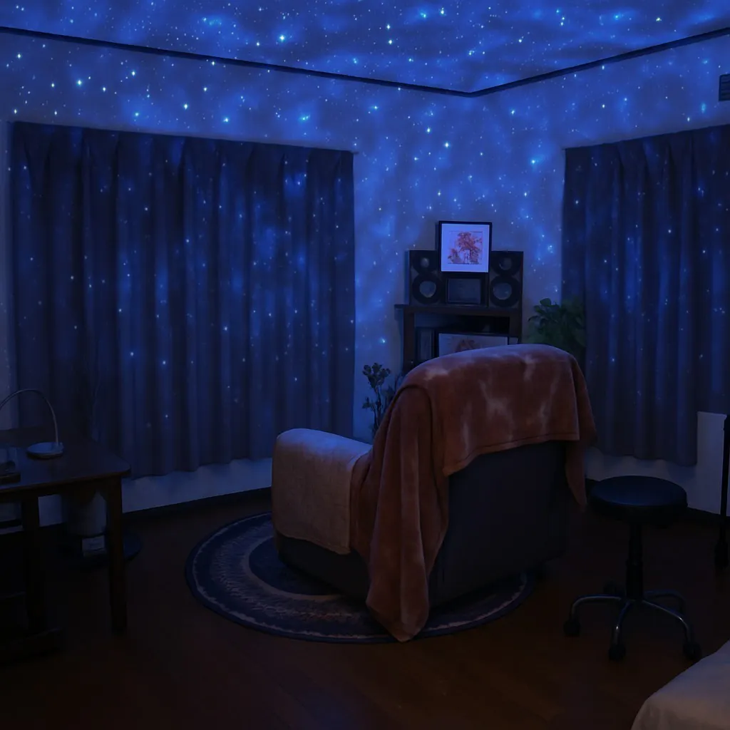 ソファーを倒し、ゼログラビティを存分に体感していただくため、暗転。そして白い壁や天井には星空が。