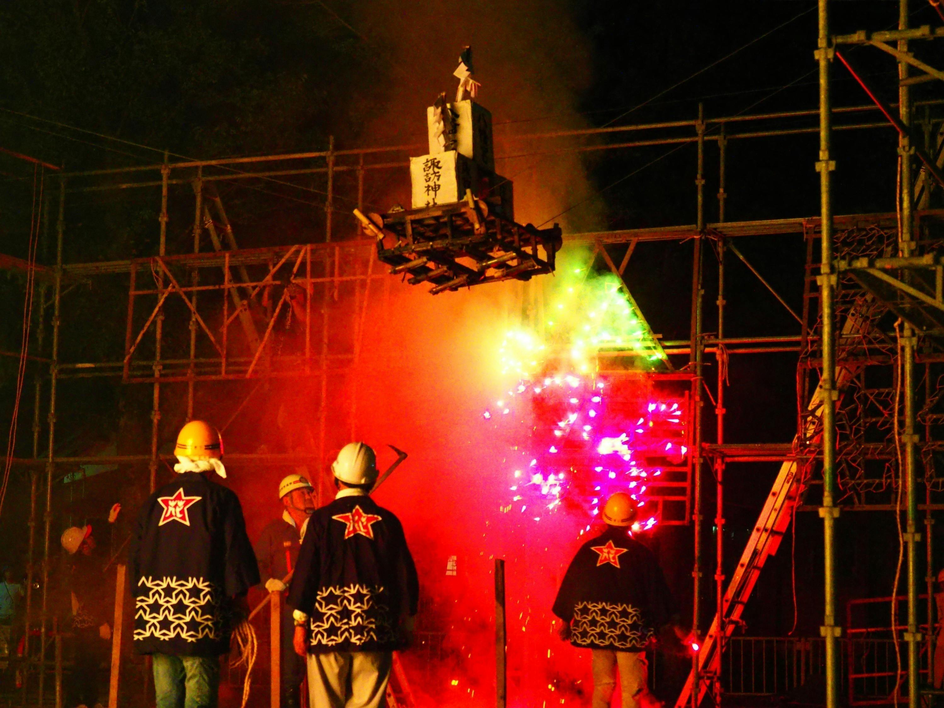 また、日本でもめずらしい花火囃子の音色にのせて地元花火師の草花火が、神社の境内で豪快に火を噴きながら上げられる、大変活気のあるお祭りでした。