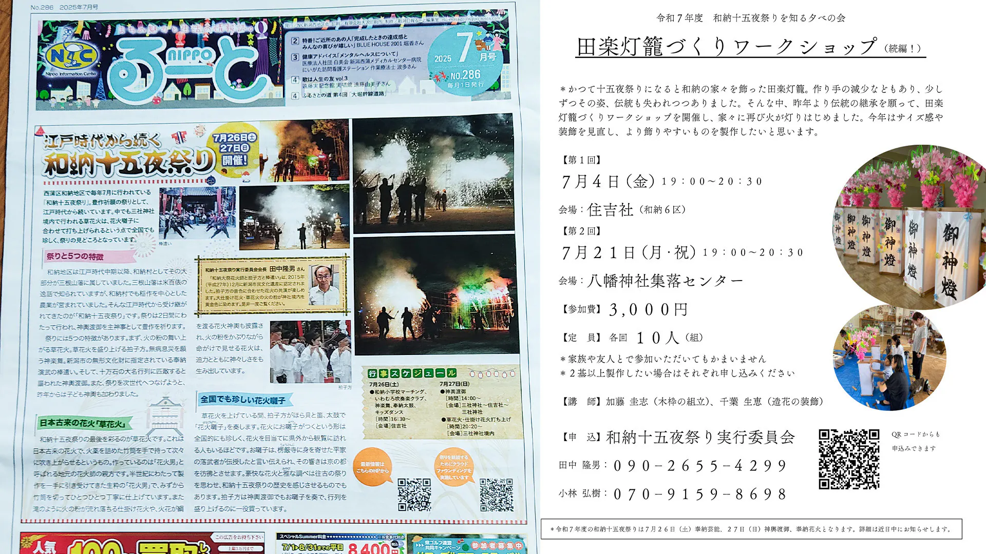 2025/07/03 09:417月に入りいよいよ祭り気分も高まってまいりました!さらに気分を盛り上げるために7/4(金)、7/21(月・祝)にお祭りの田楽灯籠を作るワークショップを開催します!今回はお部屋にも置けるミニサイズで1年中お祭り気分を味わえます!両日とも参加費は3,000円、定員は10名です!ぜひ振るってご参加ください!※詳細は画像をご覧ください。また、7/1に新潟日報別冊「るーと」に和納十五夜祭りが取り上げられました!お祭りのいわれや花火のお話など詳しく掲載されています!特設サイトやクラウドファンディングを確認できるQRコードも掲載していただきましたので、お祭りの情報など、こちらからもチェックできますのでご活用ください!皆様からご支援いただき、誠にありがとうございます!クラウドファンディングも残すところ約3週間となりました。まだまだご支援をいただきたく、お知り合いの多などにもご紹介いただき、お祭りを一緒に盛り上げていきましょう!よろしくお願いいたします! もっと見る