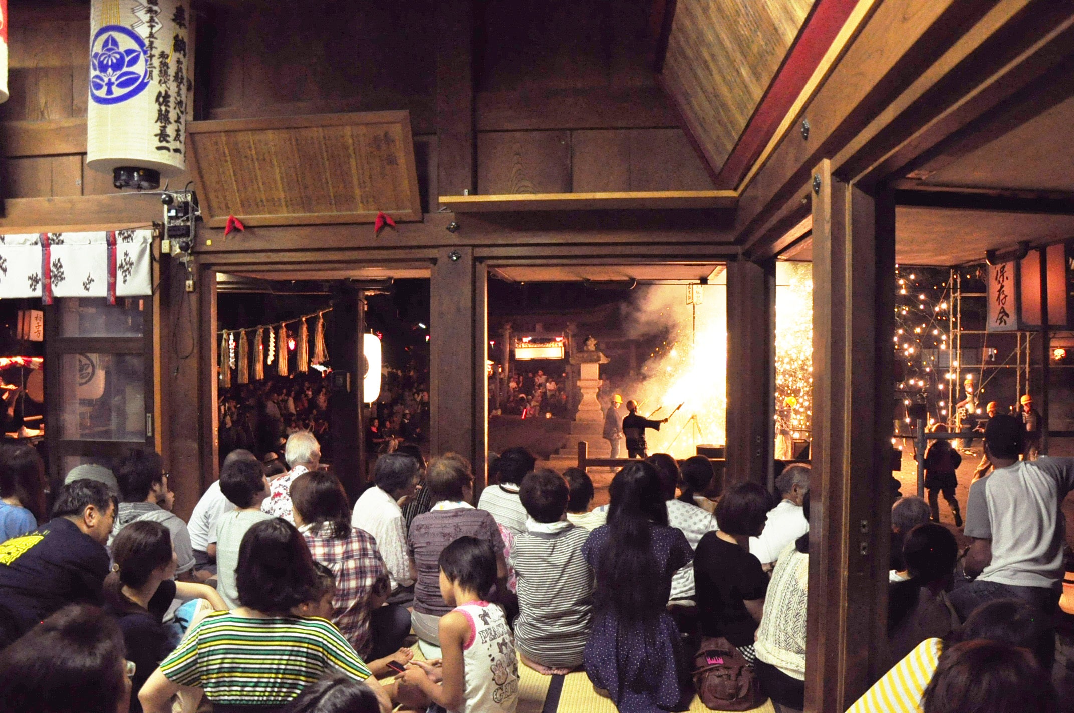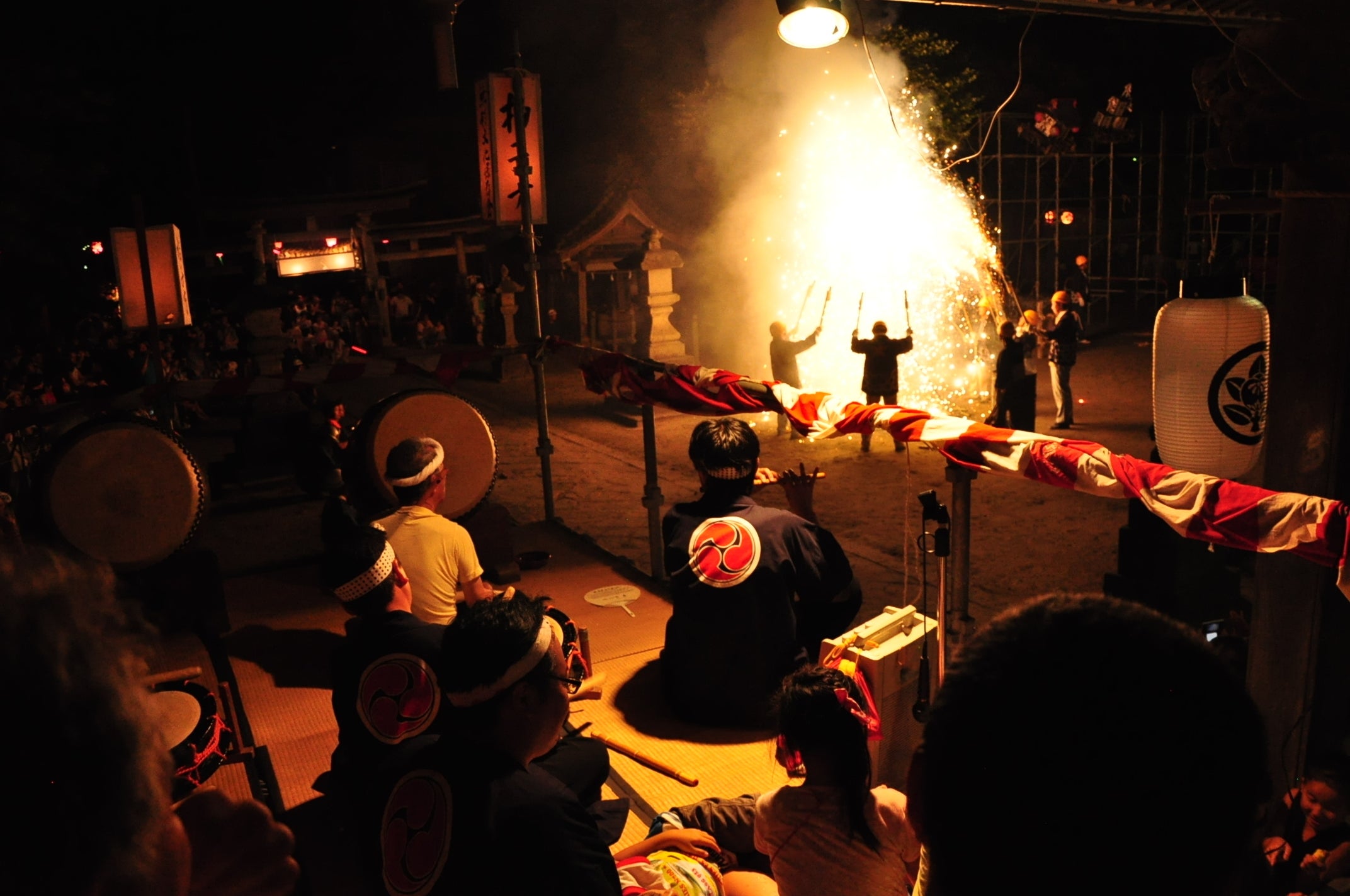 また、日本でもめずらしい花火囃子の音色にのせて地元花火師の草花火が、神社の境内で豪快に火を噴きながら上げられる、大変活気のあるお祭りでした。
