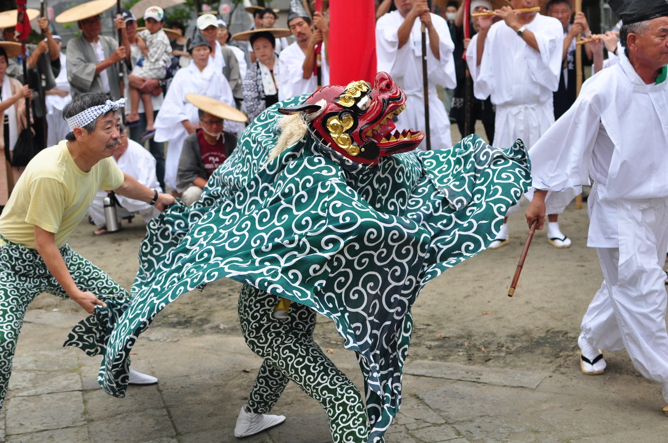 獅子の顔をした神楽で悪霊払いの舞を東西南北の四方で舞い、無病息災を祈念します。