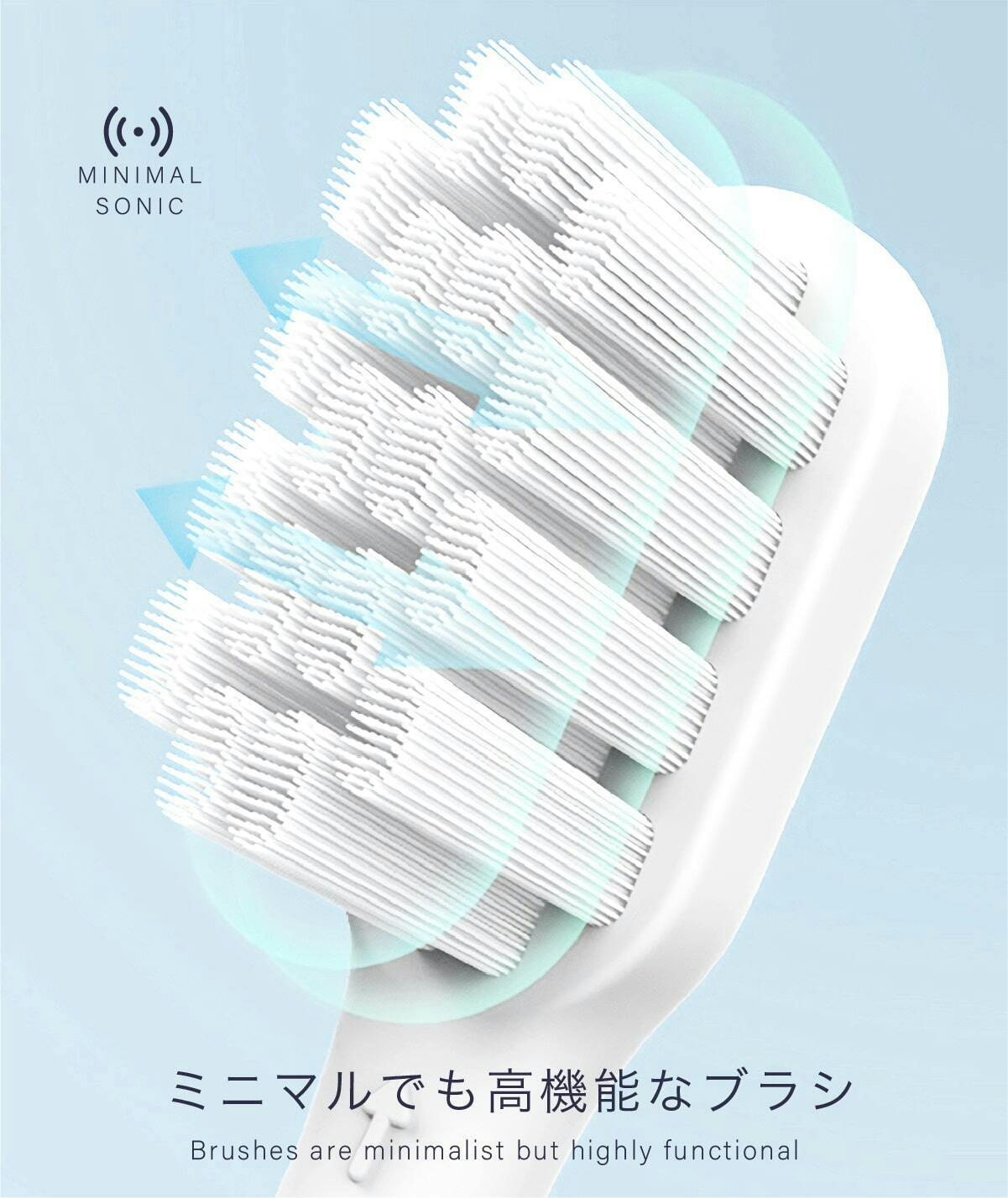 今までの電動歯ブラシを大きいと感じたことはありませんか?普通の歯ブラシから電動歯ブラシに変えた時にそれを大きく感じると思います。電動歯ブラシは構造上、大型化してしまうのですが、常識に囚われずまったく新しい電動歯ブラシを設計したのがこのミニマルソニックです。新発想の構造で小型でパワフル。未来の体験をはじめましょう。