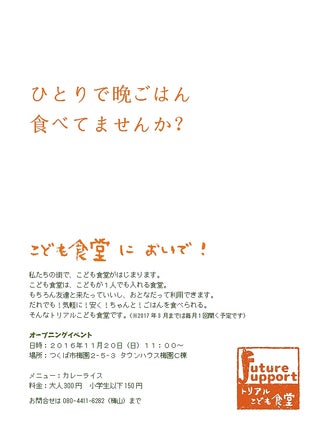 今日は気持ちのよい一日でしたね。 ご支援いただきました、こども食堂について、なかなかご報告ができず申し訳ございません。 オープンは11月20日(日)に、決まりました。 楽しいアートワークショップを、オープニングイベントとして企画中です。 お米や野菜などのご寄付もいただけるよう、交渉も進んでおります。 ノウハウのない私たちですが、まず1回目の実施を目標としてがんばっておりますので、どうぞ引き続き見守っていただければ幸いです。 NPO法人FutureSupport代表 鈴木直子