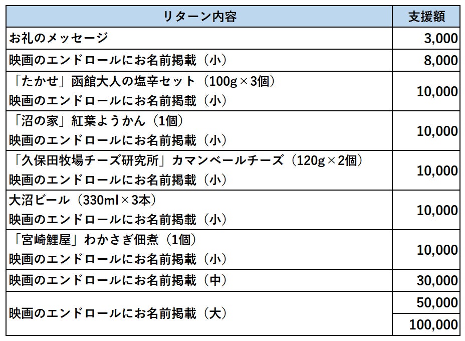 ご支援いただいたみなさまには、感謝の気持ちを込めて、映画のクレジットにお名前掲載や、道南が誇る特産品をお贈りいたします。詳しくは、リターンの欄をご覧ください。