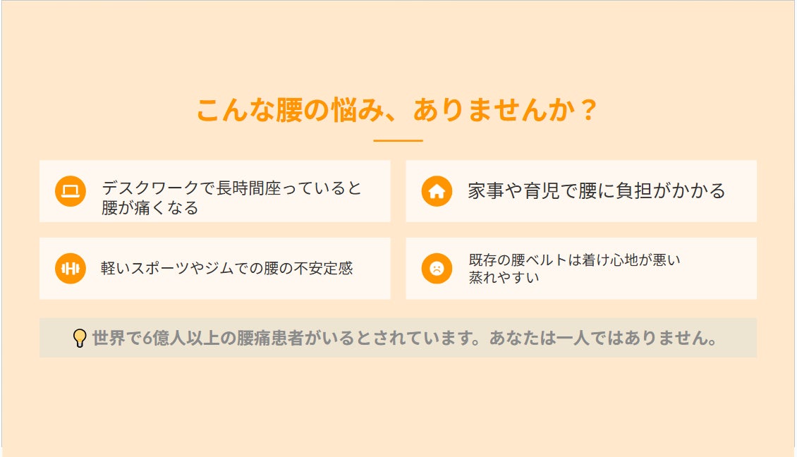 長時間のPC作業で腰の違和感に悩むスタッフの一言。「もっと簡単に、ピタッと締められる腰ベルトがあったらいいのに。」