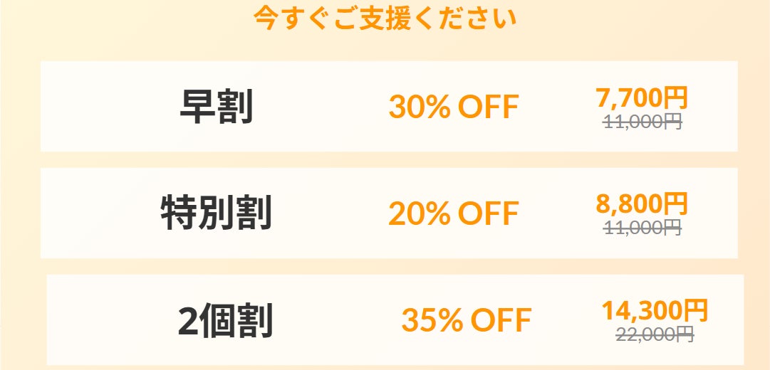 ・本プロジェクトを通して皆様から想定を上回るご支援を頂き、現在進めている環境から量産体制を更に整えることができた場合、正規販売価格が販売予定価格より下がる可能性もございます。