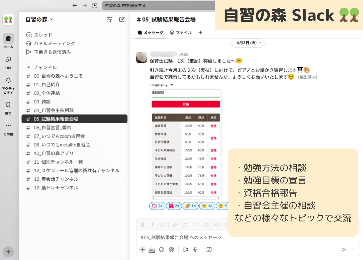 また自習会の開催以外にもコミュニケーションツールSlack上で、勉強方法の相談、勉強目標の宣言、おすすめの勉強スポットの紹介など、メンバー間の交流が活発に行われています。