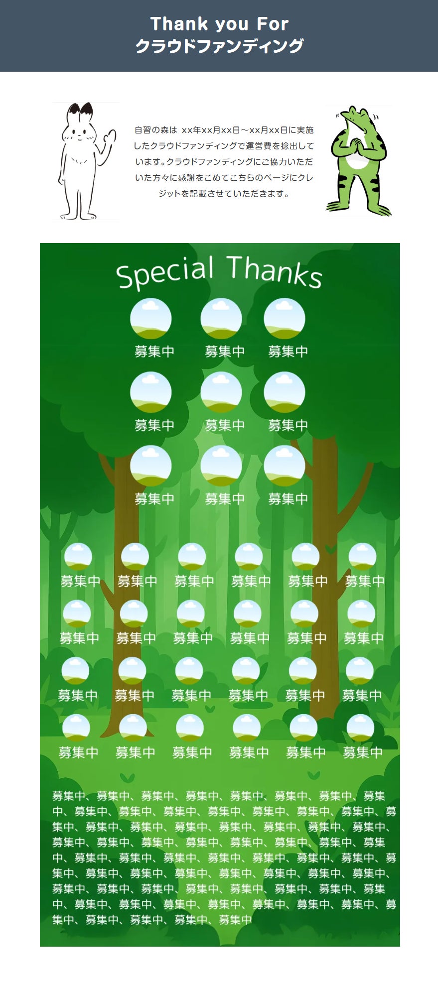 自習の森ホームページに新しくクレジットページを新設し、そちらに支援いただいた方のアカウント名を記載させていただきます。ご支援金額に応じてロゴの表示の有無や表示の大きさを変えさせていただく予定です。現在想定しているクレジット表記は以下の通りです。