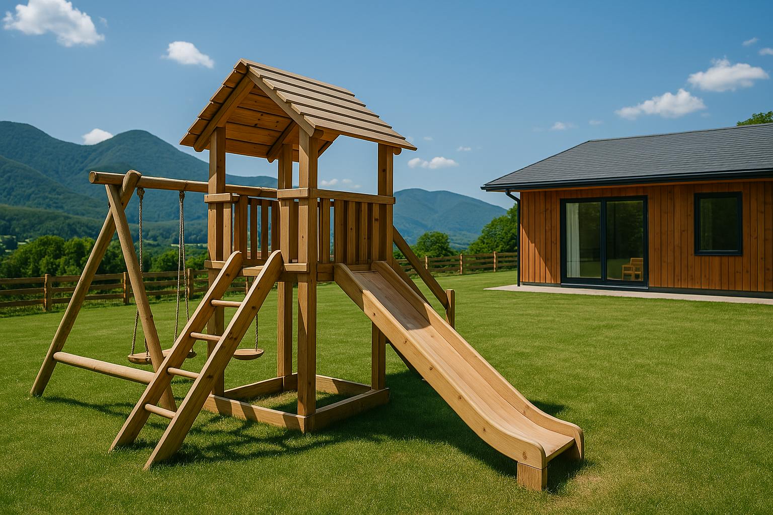 庭にはウッドデッキを設置し、その目の前にすべり台やキッズスペースを整備。