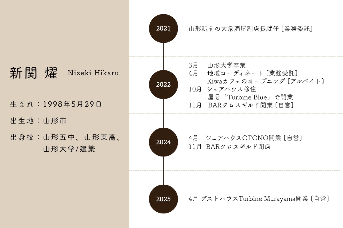 新関さんは山形大学で建築を学び、地域コーディネートや飲食店の立ち上げなど、地元に根ざした活動を積み重ねてきました。2022年には屋号「Turbine Blue」を立ち上げ、シェアハウスやバーの運営を経て、現在はゲストハウス『Turbine Murayama』を含む3棟を展開しています。